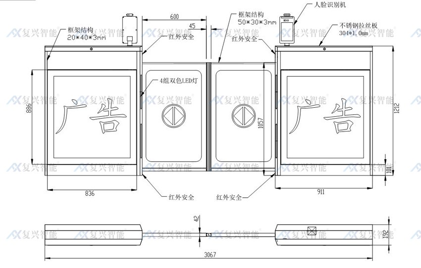 Function: The motherboard is equipped with anti pinch function, optional facial recognition, access card swiping, fingerprint, remote control, Bluetooth RF, radar, electromagnetic induction, infrared, etc. Health code facial recognition all-in-one machine. The whole machine is silent at 65 decibels, with an appearance made of 304 stainless steel material. All machined hardware accessories are CNC processed, with a surface blackening process. The overall structure is painted with 2 sets of infrared safety protection, and the chassis is inside Using 3 LED light strips, 5mm tempered glass with black paint on all sides, the movable fan is equipped with a blue super bright light strip, and the flashing red and green lights indicate the opening and closing of the door. Multiple prompt voice options are available. DC brushless motor with adjustable speed and optional emergency stop switch. The high-strength aluminum alloy multi wheel silent track has undergone 5 million 24-hour uninterrupted tests. There are LCD screens/P2.5LED displays to choose from, and the motherboard adopts LCD screen Chinese settings for easy code viewing and control!